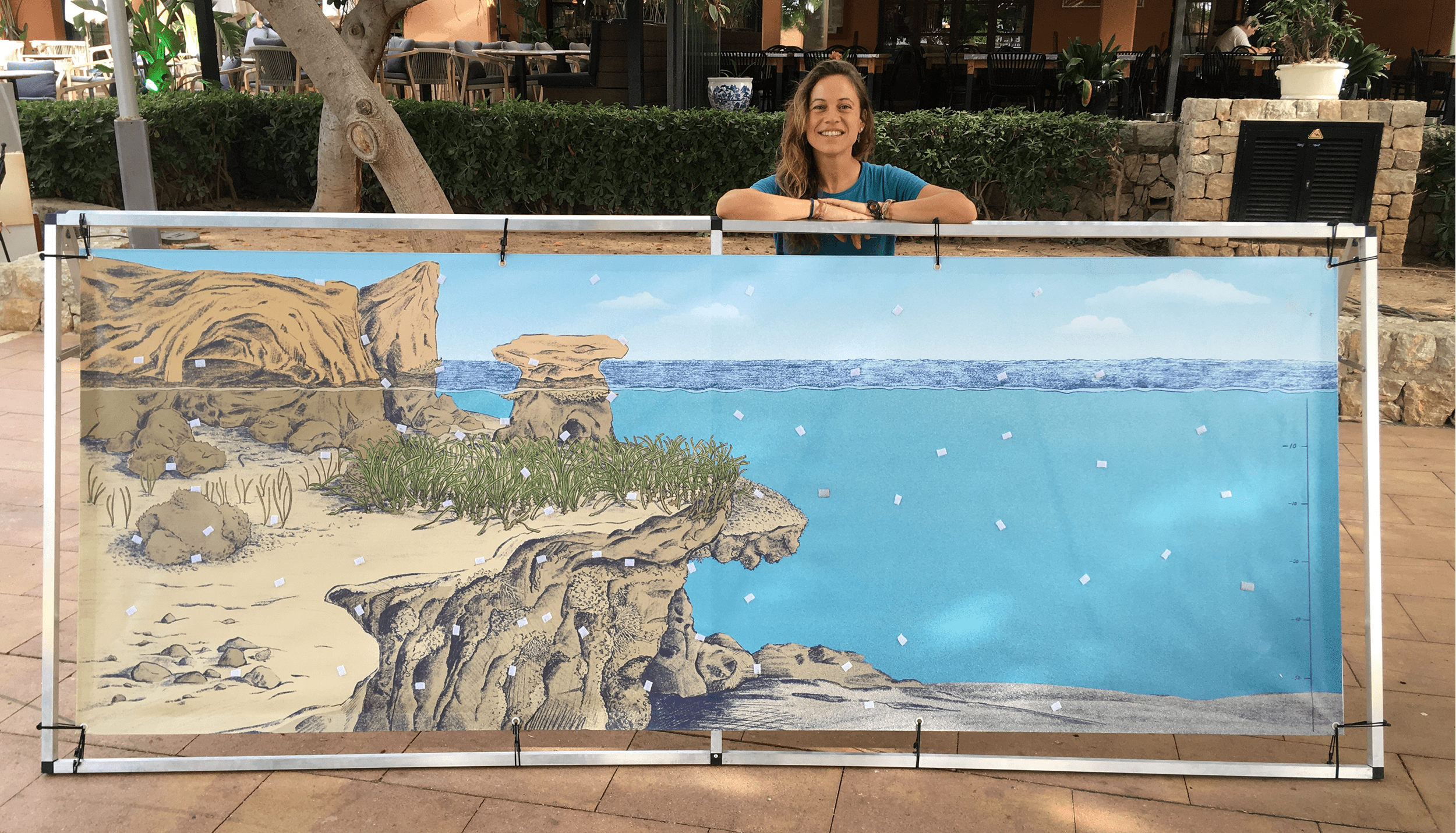 En la parte sumergida de la ilustración, se despliega un mundo submarino repleto de diversidad. Desde cuevas misteriosas hasta desplomes rocosos, praderas de Posidonia, extensos arenales, y un área pelágica, en donde los participantes explorarán la variedad de hábitats que albergan a una amplia gama de especies marinas.